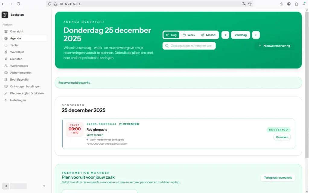 Met Bookplan kun je moeiteloos afspraken beheren, beschikbaarheid inzien en reserveringen verwerken. Of je nu een salon, barbier, restaurant of zorgpraktijk runt – Bookplan past zich aan jouw workflow aan. Het systeem is flexibel, overzichtelijk en volledig online beschikbaar, zodat jij altijd inzicht hebt in je planning, waar je ook bent.
